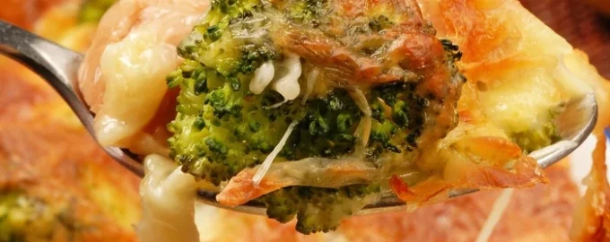 Prepare uma caçarola saudável em que os brócolos se combinam harmoniosamente com o peixe vermelho, e o recheio de ovos e natas tornará o prato tenro e suculento.
