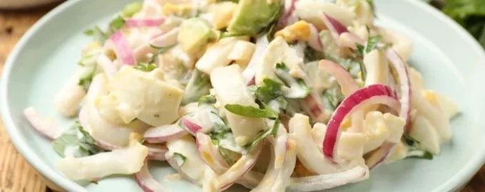 Prepare uma salada simples e rápida de lulas, ovos e cebolas. Será uma óptima decoração para qualquer mesa.