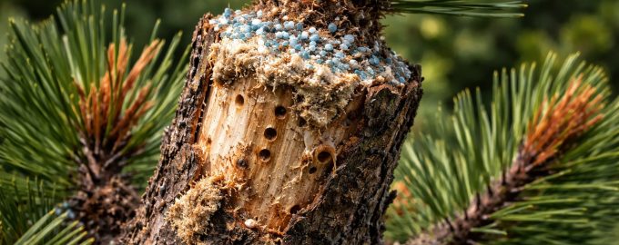 A primeira coisa a fazer é olhar atentamente para o tronco diretamente por baixo da parte murcha. Se notar pequenos buracos ou fugas de resina misturada com serradura, a árvore está a ser atacada. besouro da casca ou besouro do pinheiro. Estes insectos bloqueiam os canais de circulação da seiva e a copa deixa simplesmente de receber a nutrição.