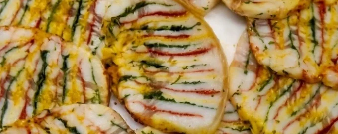 Quando a banha estiver bem refrigerada, pode ser cortada em fatias finas. O corte revela uma textura tri-colorida espetacular que parece muito apetitosa.