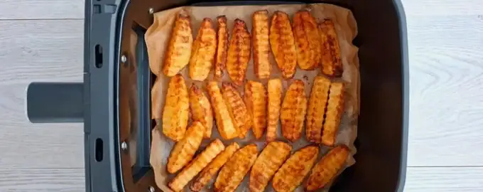 A batata estará pronta quando apresentar uma cor dourada vibrante e começar a “assobiar” levemente devido à saída de vapor.