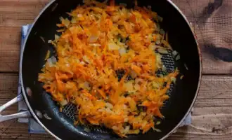 Lavar, descascar e cortar as batatas. Colocar numa frigideira untada e fritar com os seus temperos preferidos. Picar também a cebola finamente e fritar juntamente com as cenouras raladas.