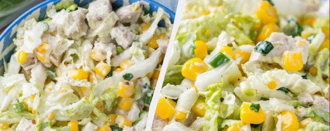 Sirva a salada com couve, milho e frango fria, polvilhada com ervas aromáticas picadas. Para que o prato dure mais tempo, gde-o no frigorífico separadamente do molho e tempere-o apenas antes de servir.