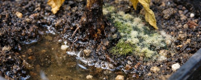 A superfície do solo fica coberta por uma escama ou bolor esverdeado.