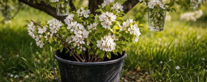 Pendure pequenos recipientes com água e ramos floridos na própria copa.