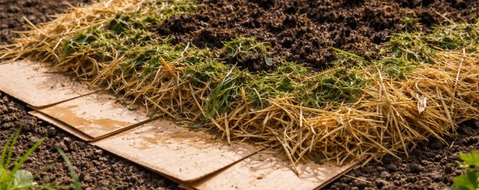 Cubra o solo com folhas de cartão sobrepostas (pelo menos 15 cm de sobreposição) para que as ervas daninhas não tenham hipótese de passar pelas aberturas.