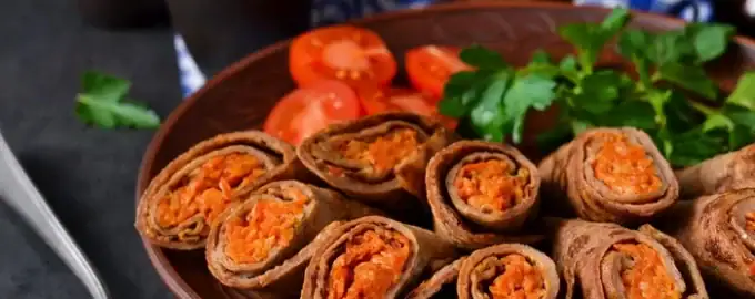 - Pincele a superfície de cada panqueca com uma camada fina de creme de ovo, coloque o recheio de legumes na borda da panqueca e enrole em forma de rolo.