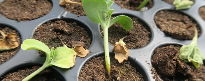 Um fator importante é o enchimento correto dos recipientes. As plantas devem estar na superfície do solo e não numa depressão. Quando as plântulas são confinadas por paredes altas de recipientes (como é frequentemente o caso quando se semeiam em caixas de bolo profundas), forma-se uma zona de ar húmido estagnado à volta dos caules. As prateleiras abertas e uma boa ventilação na sala criam condições em que o ar seco mata naturalmente o agente patogénico, impedindo-o de se agarrar ao caule delicado.