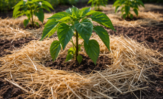 | Pimentos | Crescimento ativo da folhagem | Necessita de rega rigorosa em solos quentes |