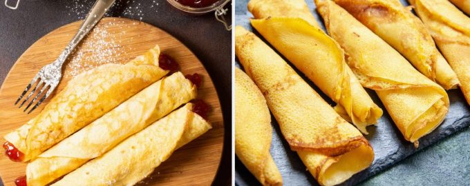 Cozinhe panquecas finas com leite e envolva nelas três dos seus recheios preferidos de uma só vez. Envolver três recheios em panquecas normais de uma só vez /.
